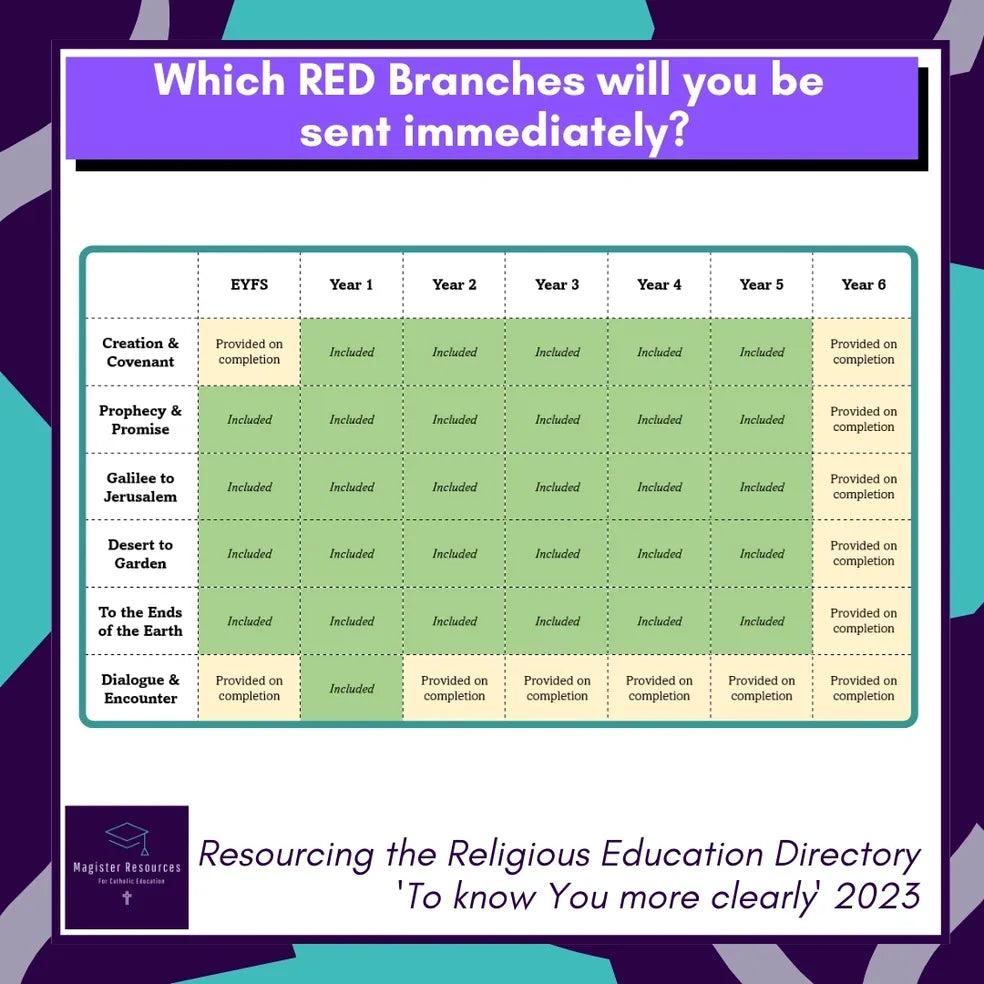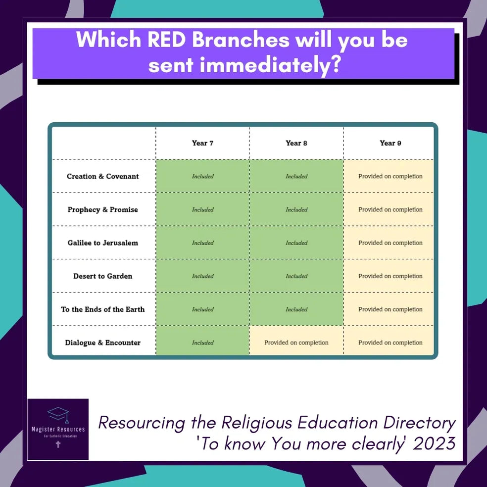 All 6 Religious Education Directory branches (Creation & Covenant, Prophecy & Promise, Galilee to Jerusalem, Desert to Garden, To the Ends of the Earth, Dialogue & Encounter).