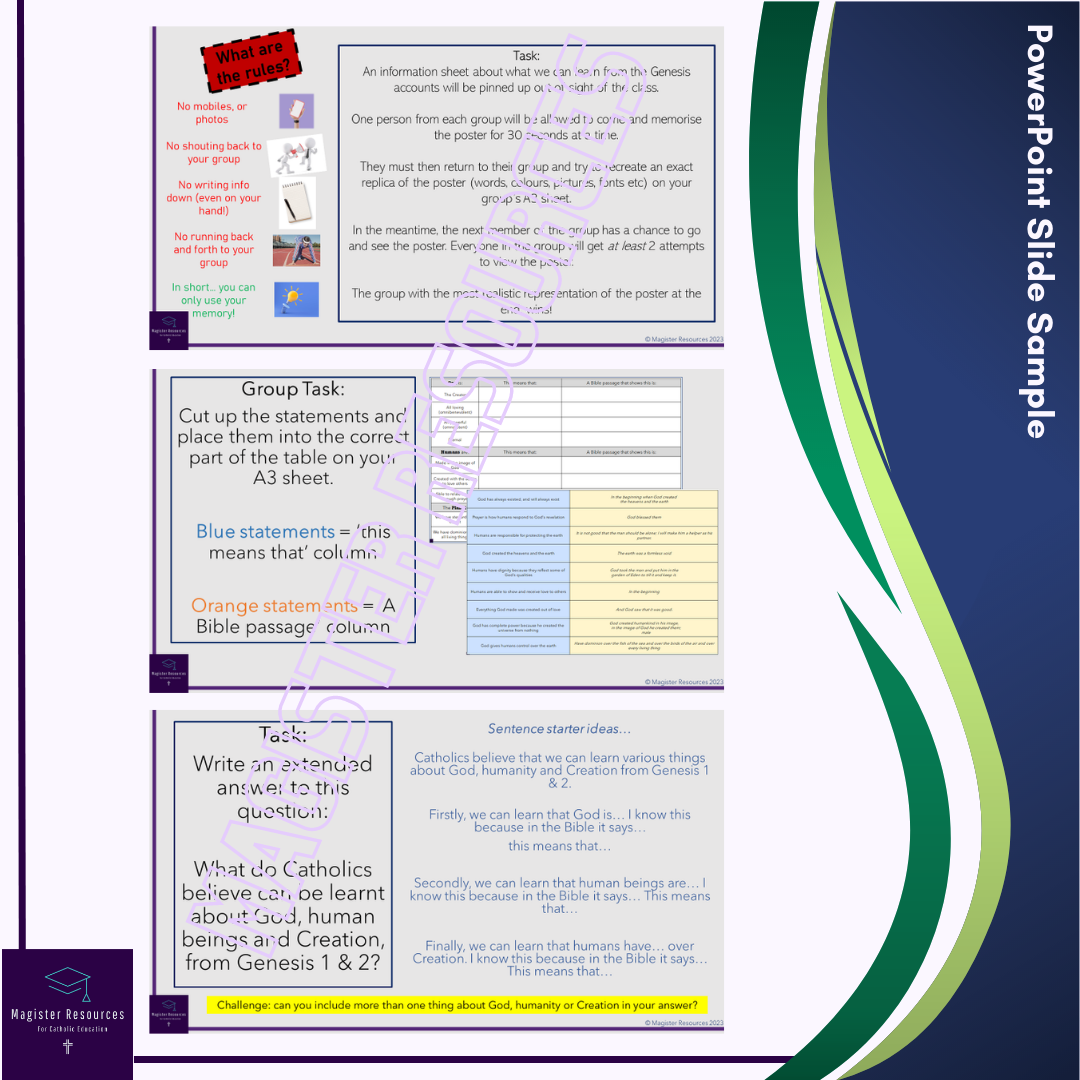 - Memorise It - a group game requiring pupils to memorise the Catholic teachings about Genesis on an A3 poster and recreate it at their tables. Teachings included are about the nature of God, humanity and our responsibility to the planet.