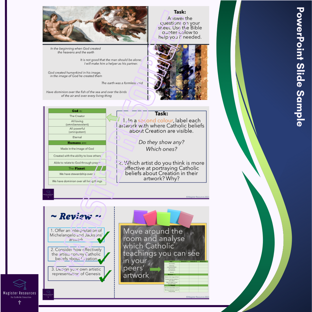 - Artwork - double-sided A4 sheet with images of Michelangelo's Creation of Adam and Donald Jackson's Genesis Frontispiece, and questions prompting pupil reflection and links to Genesis.