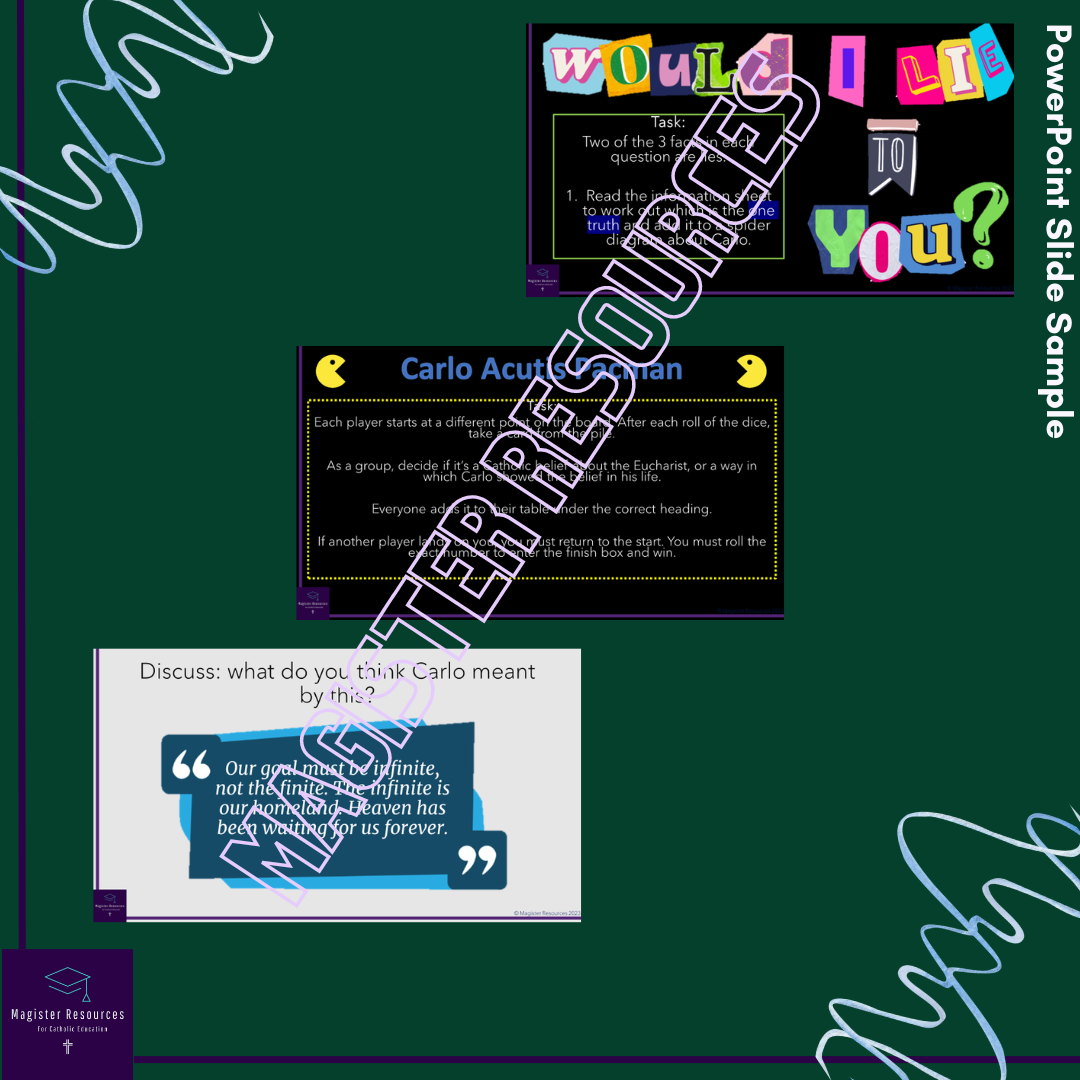 - Play It: Pacman - a board game version of Pacman, in which pupils move their counters to the middle of the board, answering questions about how Carlo put Eucharistic beliefs into practice in his life.