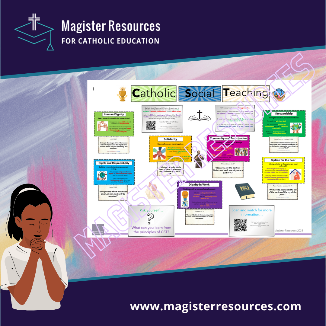 Bring the heart of the Church’s mission to life with this Catholic Social Teaching (CST) Display Pack, a clearly designed visual resource that helps pupils understand, reflect on, and live out the seven principles of Catholic Social Teaching. Perfect for classrooms, corridors, chapels, and RE learning walls, this display invites students into deeper engagement through Scripture, the Catechism, imagery, and interactive QR codes.