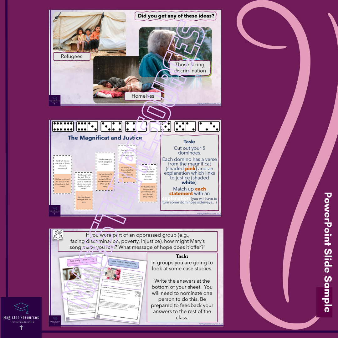 - Dominos - A set of 5 Dominos for each student. Students are to match the quote from the Magnificat with an explanation and link to social justice.