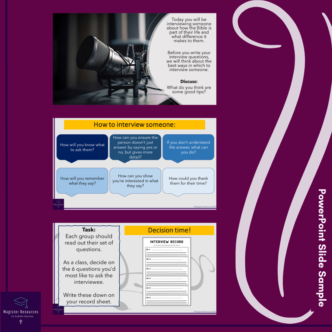 *This lesson relies on the teacher having lined up someone to be interviewed about their use of the Bible, such as another teacher, Headteacher, sixth form pupil, Governor, Parish Priest etc.