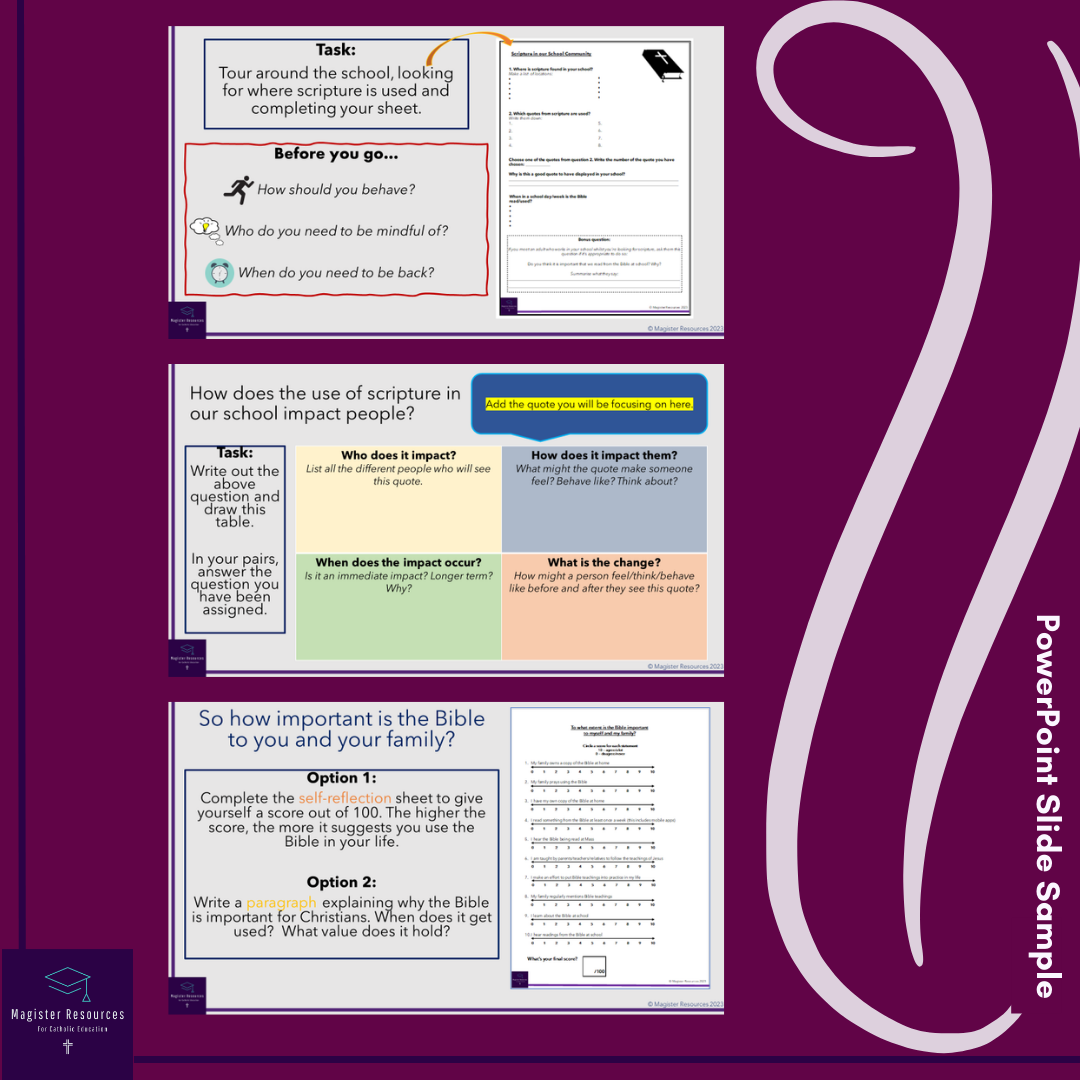 - Self-Reflection Quiz - 10 questions in which pupils rate themselves on a scale of 1-10, based on how much they use Scripture in their lives and that of their family.