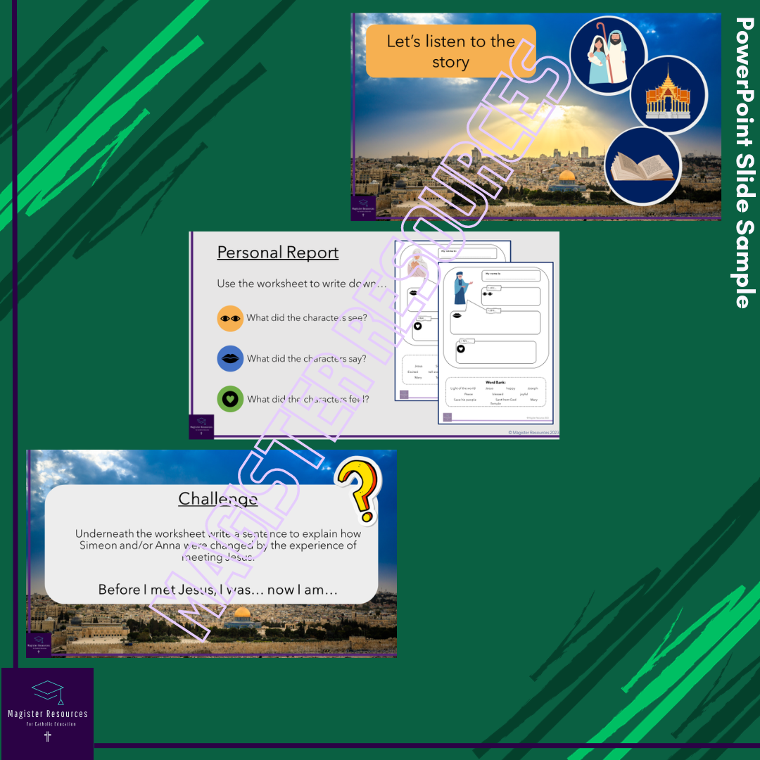 - The Presentation Script (copy for teacher) Fact file sheets - A worksheet with space for children to record what Simeon and Anna say, said and felt when they met Jesus.